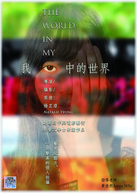 《我眼中的世界》 楊芷澄 Short Film(Individual) 好,首先,很希望大家能靜下心來欣賞這份作品,亦很希望在觀看過後能為您的內心帶來温暖和平靜。這份Video Art作品中有五個顏色層次:綠色(創造)、黑色(墮落)、紅色(救贖)、白色(稱義)和黃色(榮耀),皆代表著「我」眼中所看到的世界,一個屬於天父的世界。我在鏡頭中加入了隱喻和意識流,並集中於帶有實驗性地紀實存真,以非故事的形式訴說一個故事,紀錄一個世界。感恩謝謝! 觀看預告