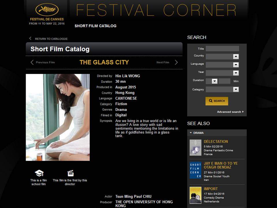黃顯力導演作品《玻璃城》(2014鮮浪潮學生組「特別表揚奬」)參與69屆法國康城電影節。