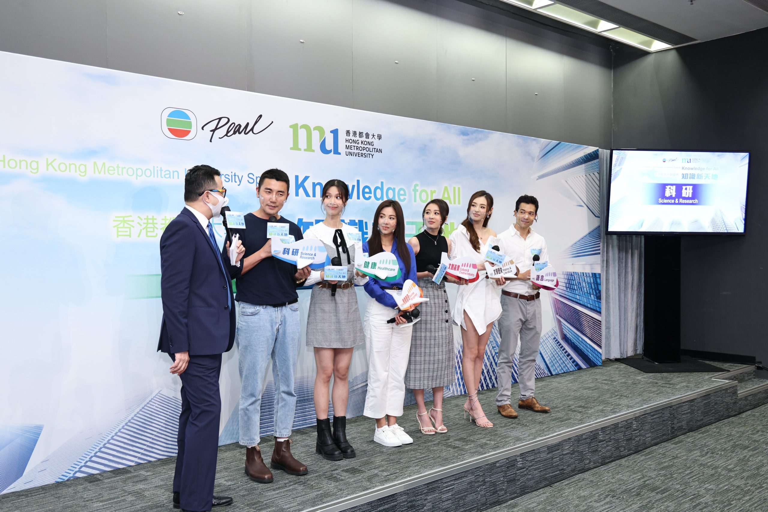 A press conference to launch the new series of “Knowledge for All” TV programme was held today (17 September) on HKMU's Jockey Club Campus. Officiating at the ceremony were HKMU President Prof. Paul Lam Kwan-sing and TVB Deputy General Manager (Legal & International Operations) Mr Desmond Chan Shu-hung. Other guests included HKMU Provost Prof. Reggie Kwan Ching-ping, Vice President (Resources and Development) Prof. Lui Yu-hon, Vice President (Students and Support) Prof. Ricky Kwok Yu-kwong, Director of Advancement of Learning and Teaching Dr Eva Tsang Yuen-mei, Director of Public Affairs Ms Florence Chan Yuk-sau, TVB Deputy Controller (Sales) Mr Benny Chung, Assistant Controller (Programme) Ms Nancy Lai, artistes Hera Chan Hiu-wa, Celina Harto, Tony Hung Wing-shing, Derek Alan James Mackesy, Kelly Ng Lok-yee, Wong-fei, and the master of the ceremonies Miguel Choi Hong-nin.