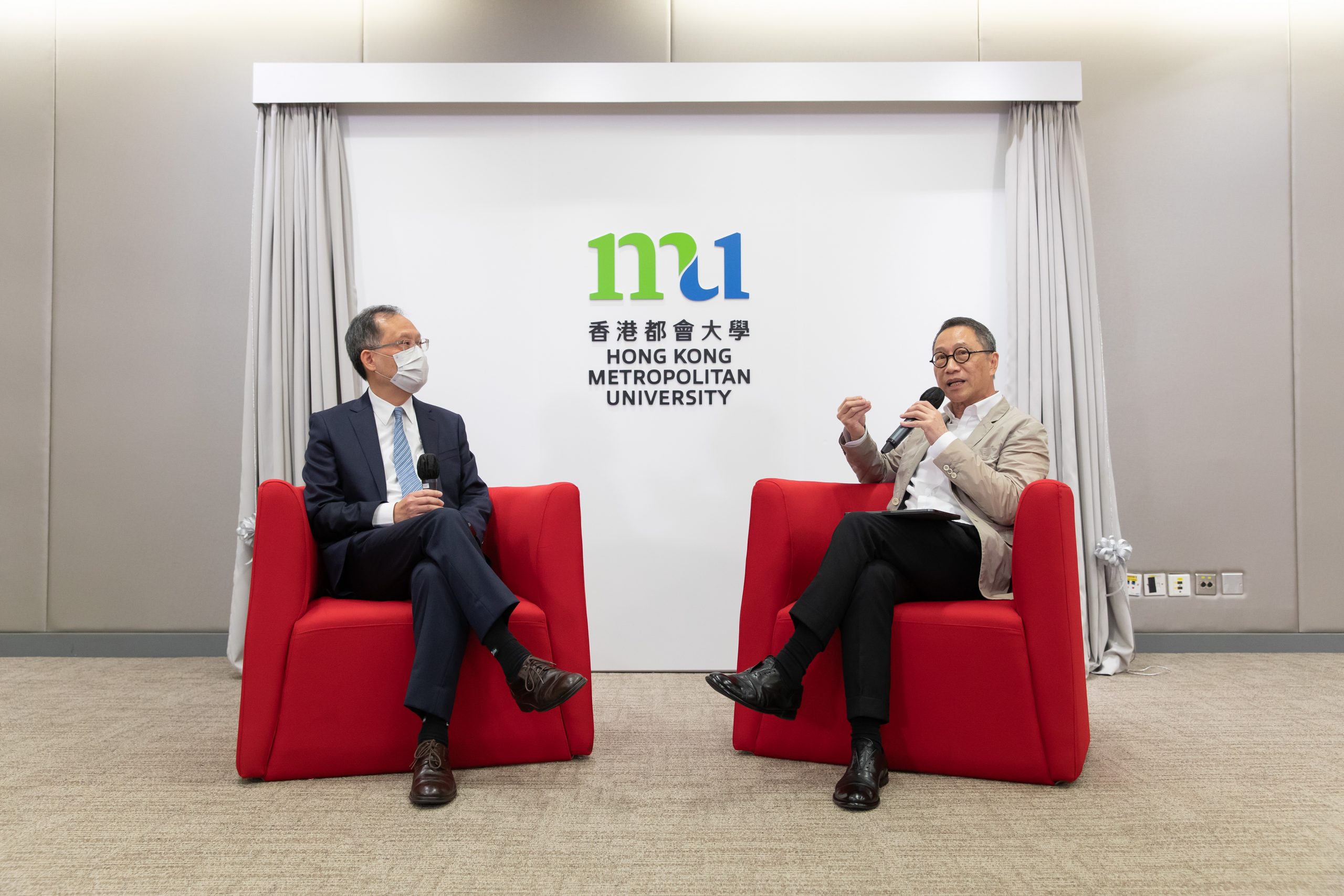 公大校長林群聲教授(左)與陳幼堅設計公司始創人兼創意總監陳幼堅(右)公布香港都會大學校徽。