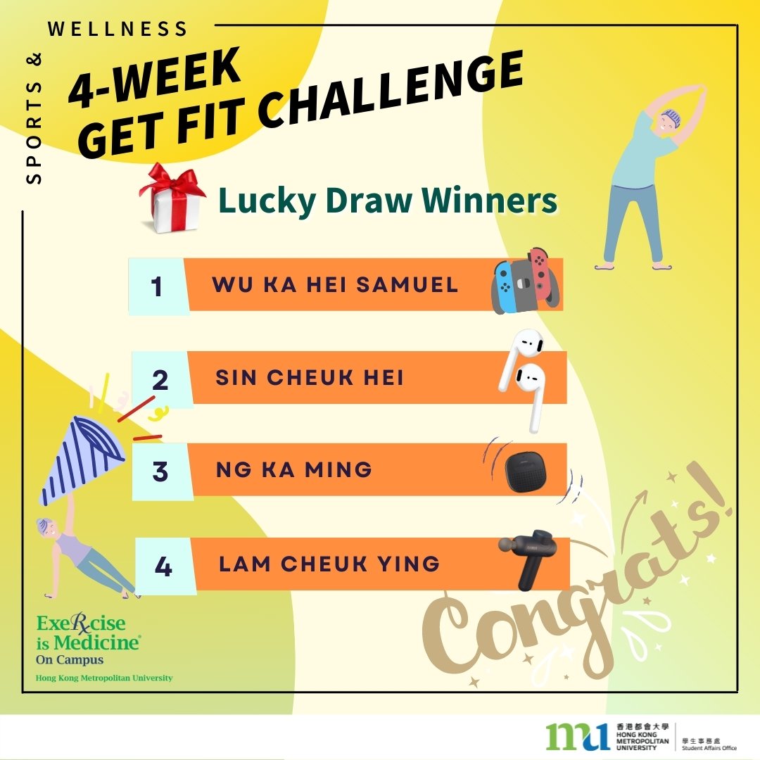 Thank you for your participation in the 4-Week Get Fit Challenge. The lucky draw was held on 13 May 2022, and results are as follows.