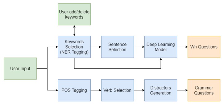 The aim of this project is to develop a system that can automatically generate questions from text using AI technology. This system can generate wh questions and grammar questions, and it is mainly designed for educational purposes. For example, helping teachers to generate quiz or assignment questions for their students and helping parents to generate practice questions for their children. It can also be used to generate questions for building a reading comprehension dataset, this kind of dataset is widely used in the studies of Natural Language Processing (NLP).