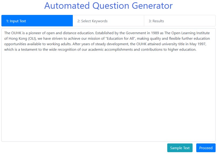 The navigation bar shows 3 steps of the system: input text, select keywords, and results, they are clickable to switch between pages. Because it is a single page application, there will be no full page loading on user interaction. After inputting a text, click on the “Proceed” button to the next step.