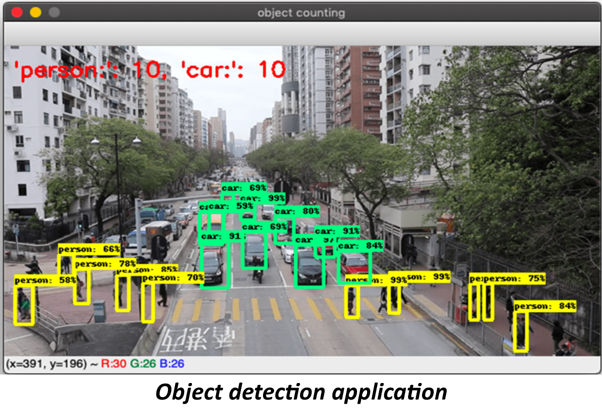 The object detection application tells users the object type (vehicle or person) in the road and show the number of vehicles and pedestrians at the road intersection per hour.