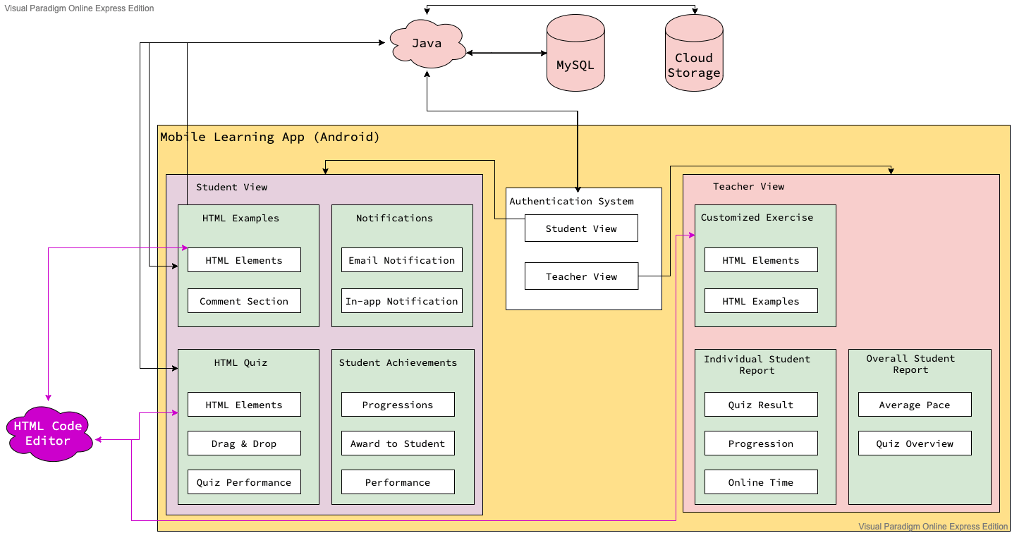 The HTML Learner Application will be built using Android as the OS and several technologies such as Java, Google Firebase Storage, MySQL, PHP, and Material Design will be involved. The tasks will be split into smaller manageable units using divide and conquer and the task will be assigned to teammates. For the student and teacher view in the application, Session will be used to keep track of the access rights and update the corresponding UI such as menu items to users. Each student will have their achievement list according to the HTML Quizzes results, their result will be stored in MySQL using PHP. In order to display the achievement, a JSON array will be returned from PHP server and the report interface will be displayed. Information Hiding and Encapsulation (Ricciardi, 2016) will be used to hide our implementation method and encryption algorithms.