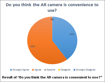 40% participants strongly agree the AR camera is convenient to use and 60% participants agree AR camera is convenient to use. All students agree AR camera is convenient to use. It may due to the off-marker function because the users can still view photo even though leaving the wall.