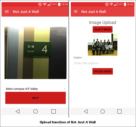 The user selects the location of the campus to put a meaningful photo by the spinner. Then, user can choose to take a photo instantly or grab from the phone album. A caption can be added before the photo is uploaded.